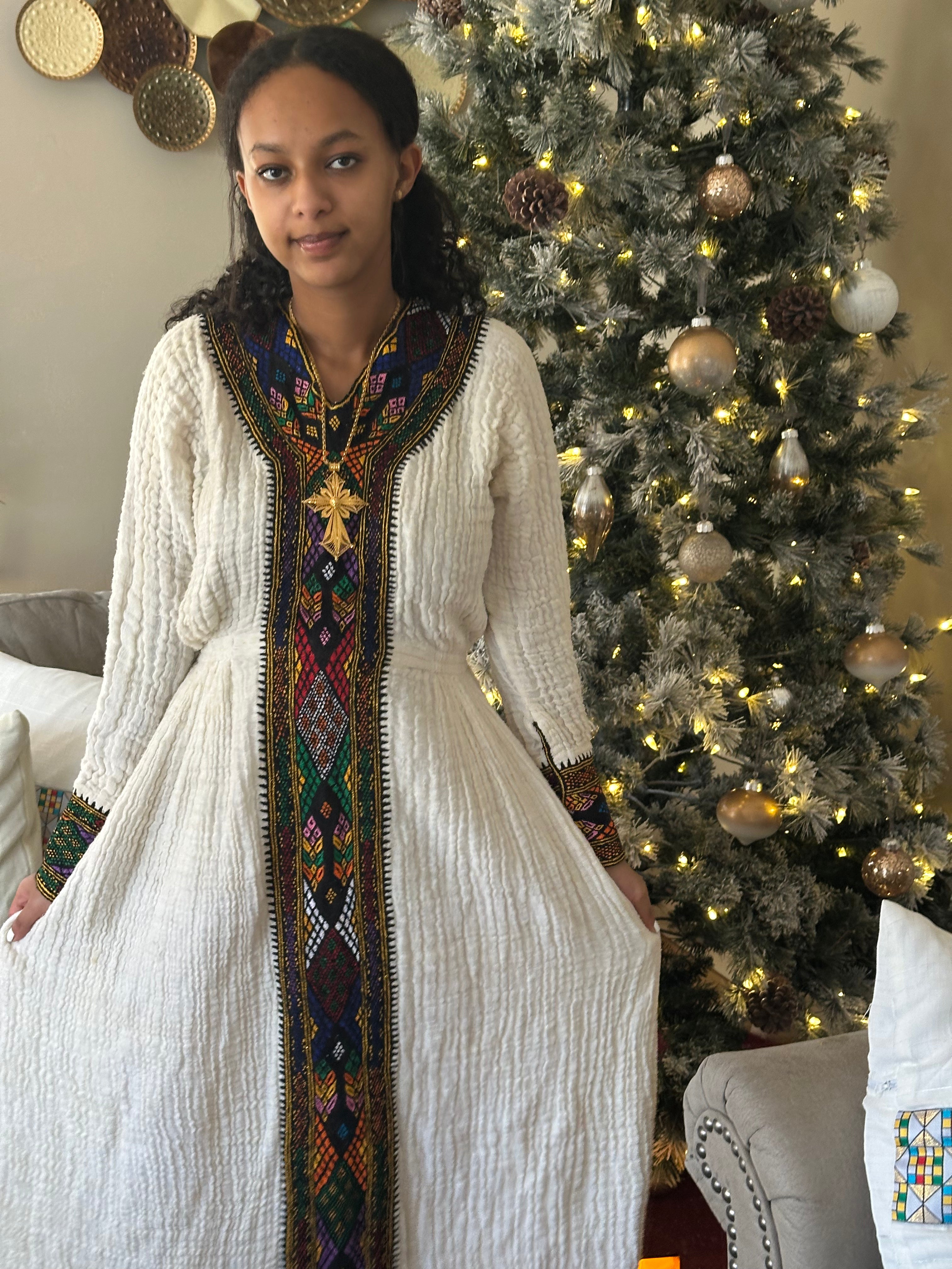 Ethiopian White Traditional Dress with Golden Accents